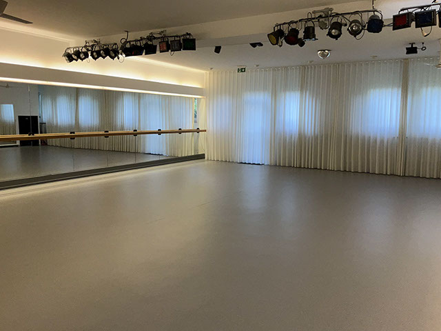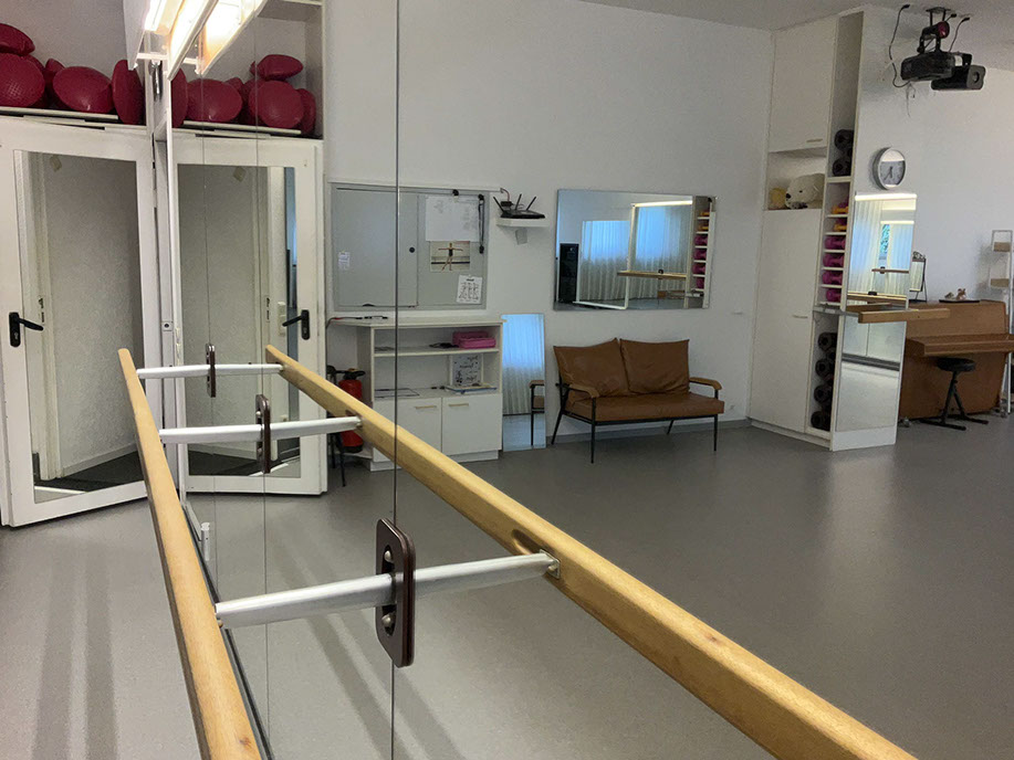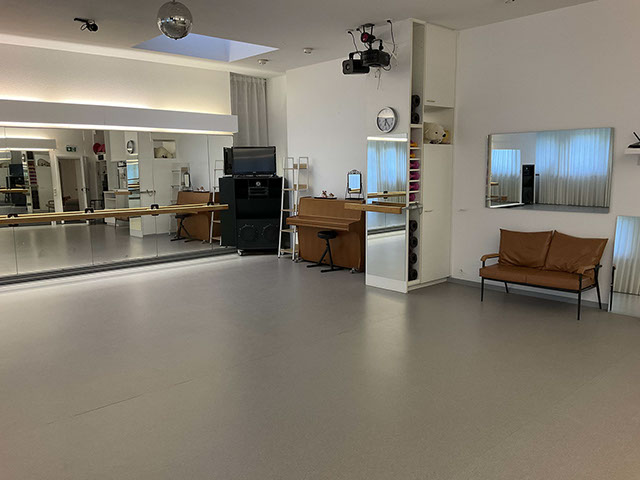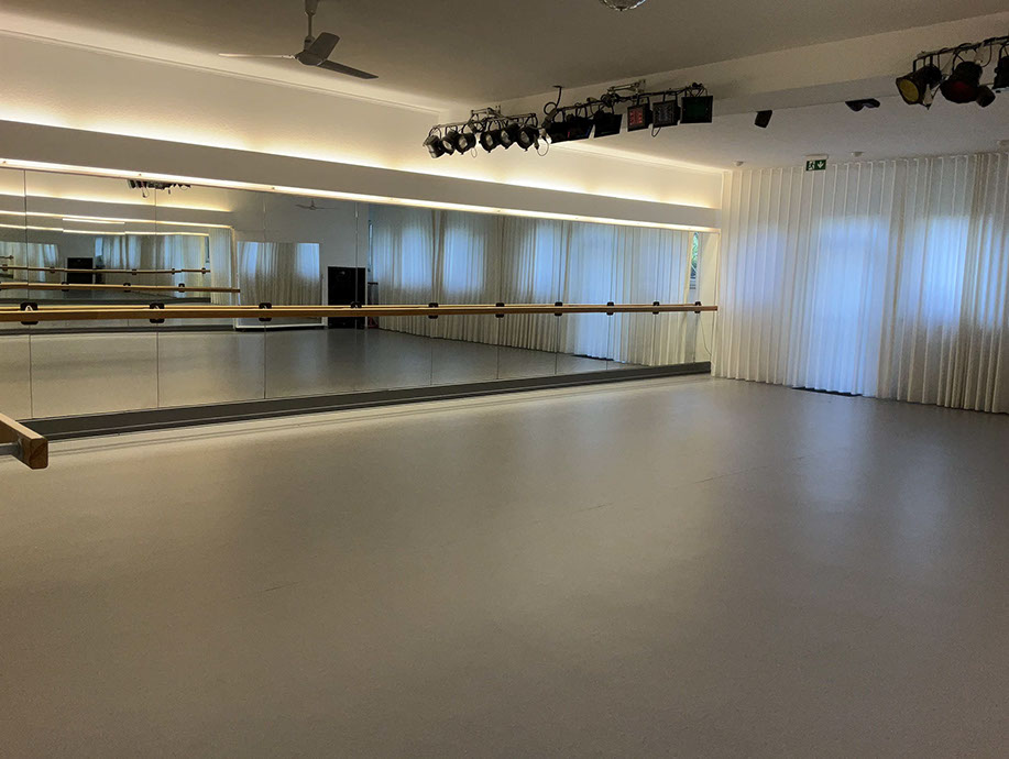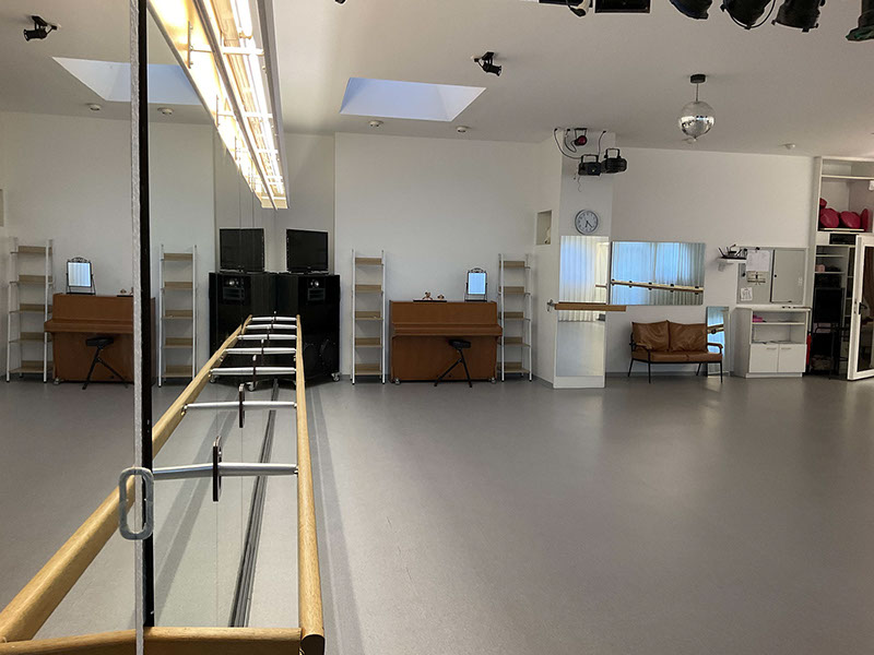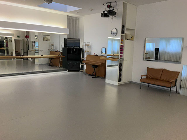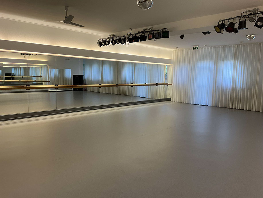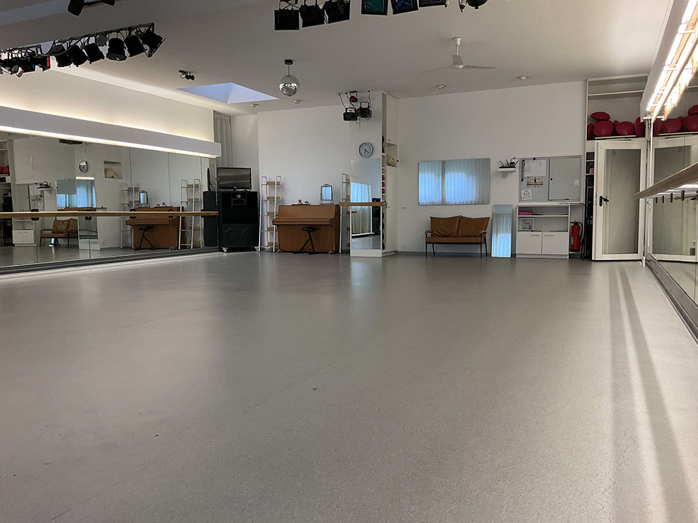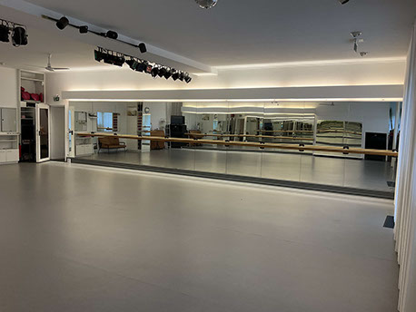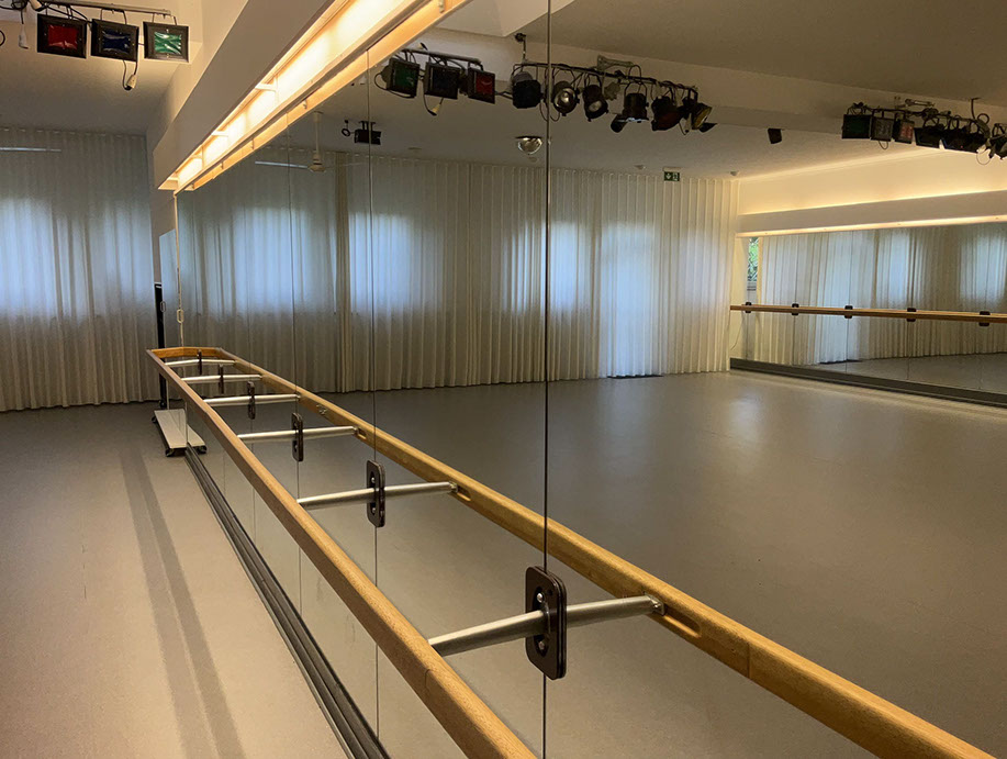 Der großzügige und Tageslicht durchflutete Ballettsaal hat eine Fläche von ca. 120 m2 und ist über eine Wandfläche von ca. 18 m mit bodentiefen, ca. 2,2 m hohen Spiegeln ausgestattet. Er verfügt insgesamt über ca. 20 m Ballettstangen.