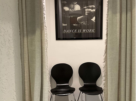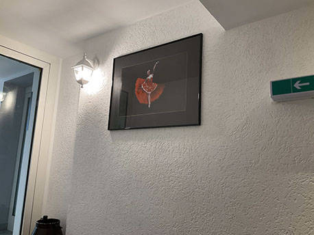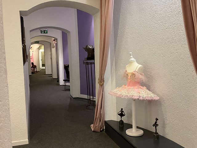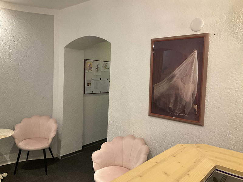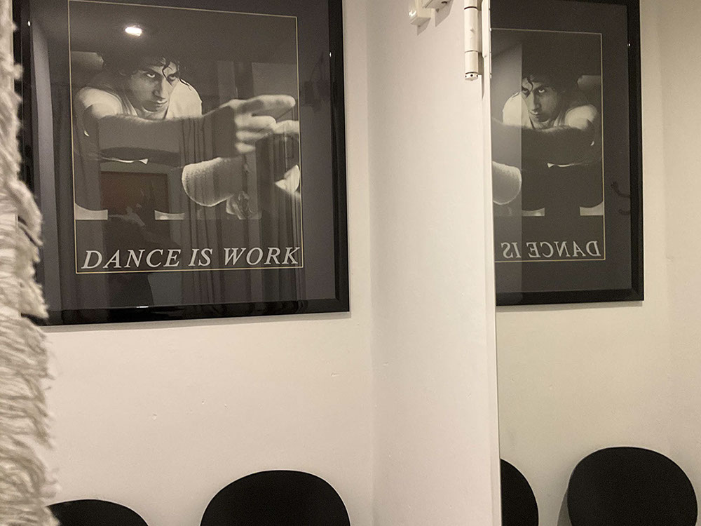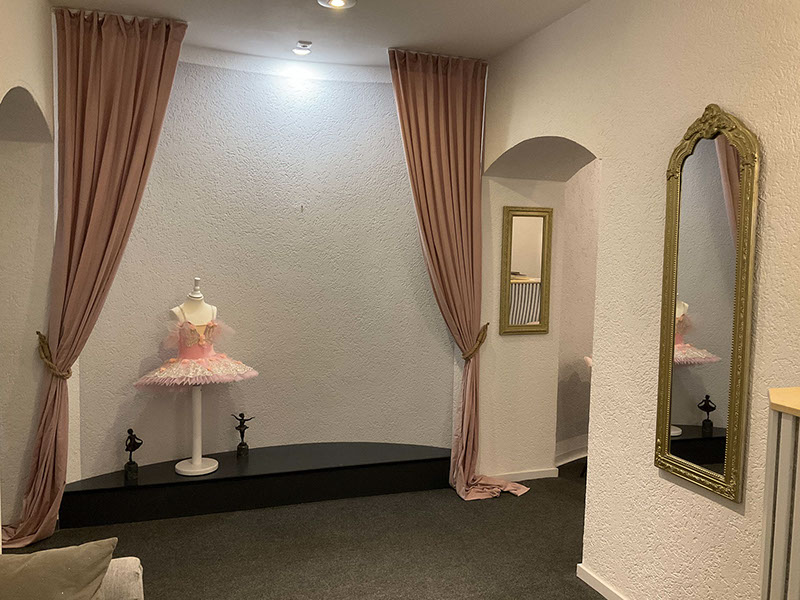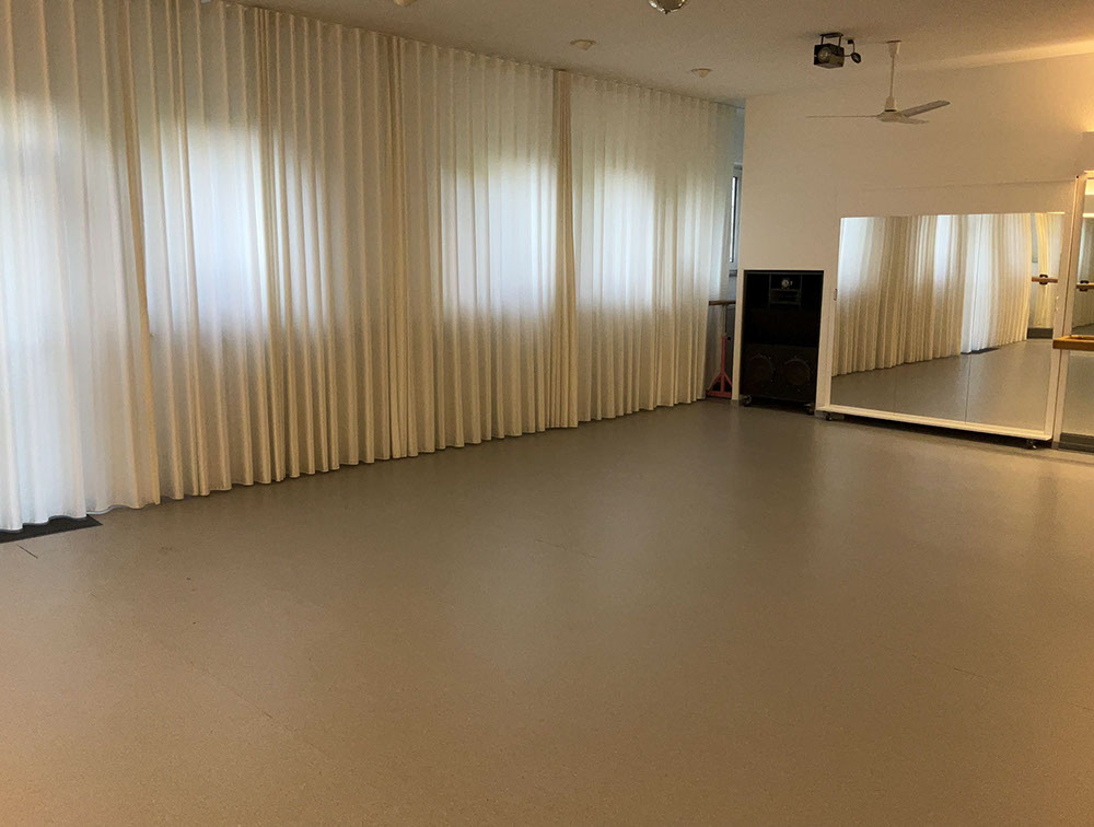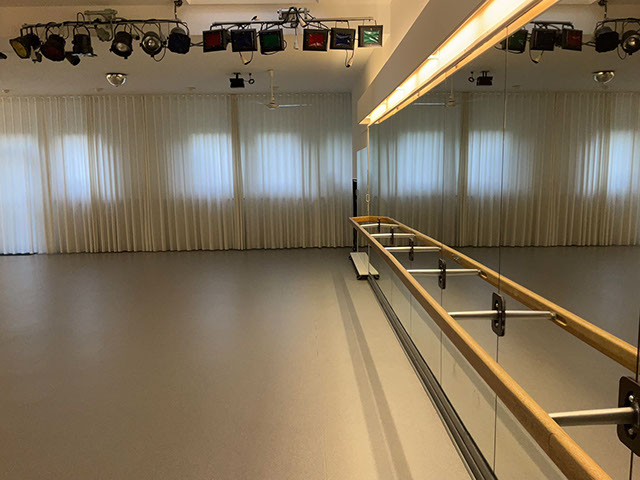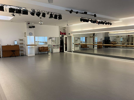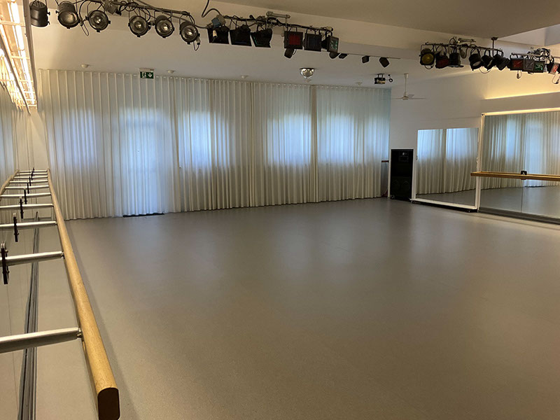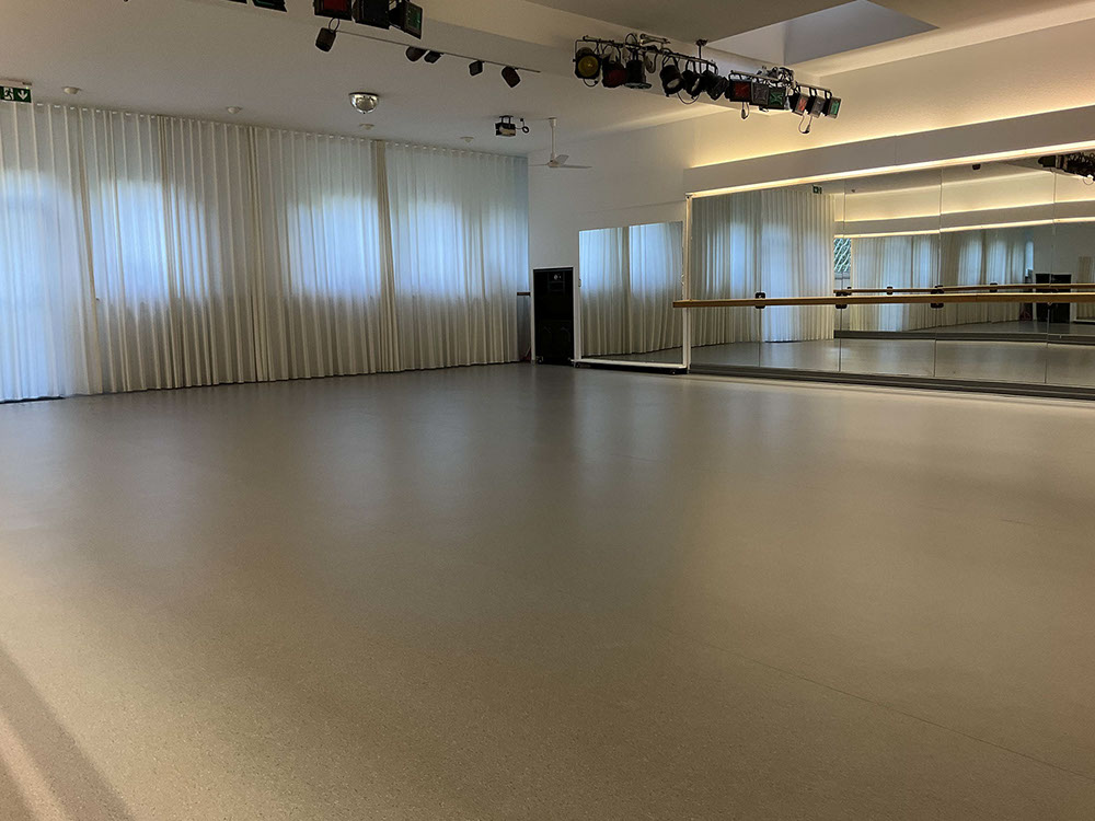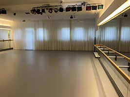 Der großzügige und Tageslicht durchflutete Ballettsaal hat eine Fläche von ca. 120 m2 und ist über eine Wandfläche von ca. 18 m mit bodentiefen, ca. 2,2 m hohen Spiegeln ausgestattet. Er verfügt insgesamt über ca. 20 m Ballettstangen.